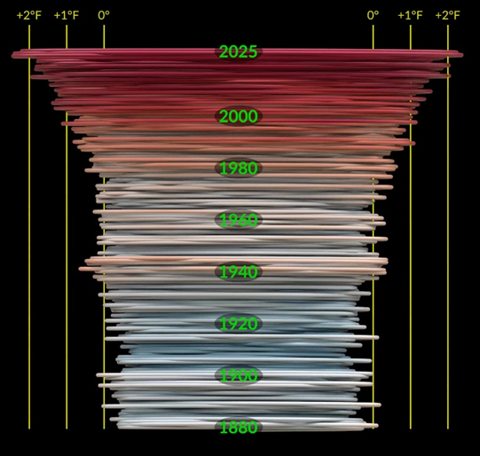 The NASA climate spiral visualization with labels in English and Fahrenheit.